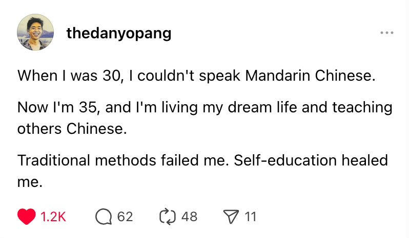 My name is Danyo.Firstly, if you don’t already know me or my story. Pause. Watch this first.In 2019 I burned out and quit my job as a medical doctor in Canada to chase my dream of learning Chinese.I was 30 years old and couldn't understand nor speak Mandarin.After struggling with traditional classes and textbooks and seeing slow progress for many months I knew I needed to change something.Thats when I developed the system for the Copy Paste Method. Within 3 months I was having 3-hour conversations with the local "aunties" in Taiwan.My speech wasn't perfect, but I was improving faster than ever before.I went from being afraid to speak to speaking Mandarin in public interviews, hosting a Chinese podcast, and posting 200+ videos with nearly 1 million views sharing the best Chinese learning tips.Learning Chinese is my passion. When you invest in this course, you invest in the hundreds of hours I spent researching, analyzing, talking to experts, and most importantly, actually learning and using the language.